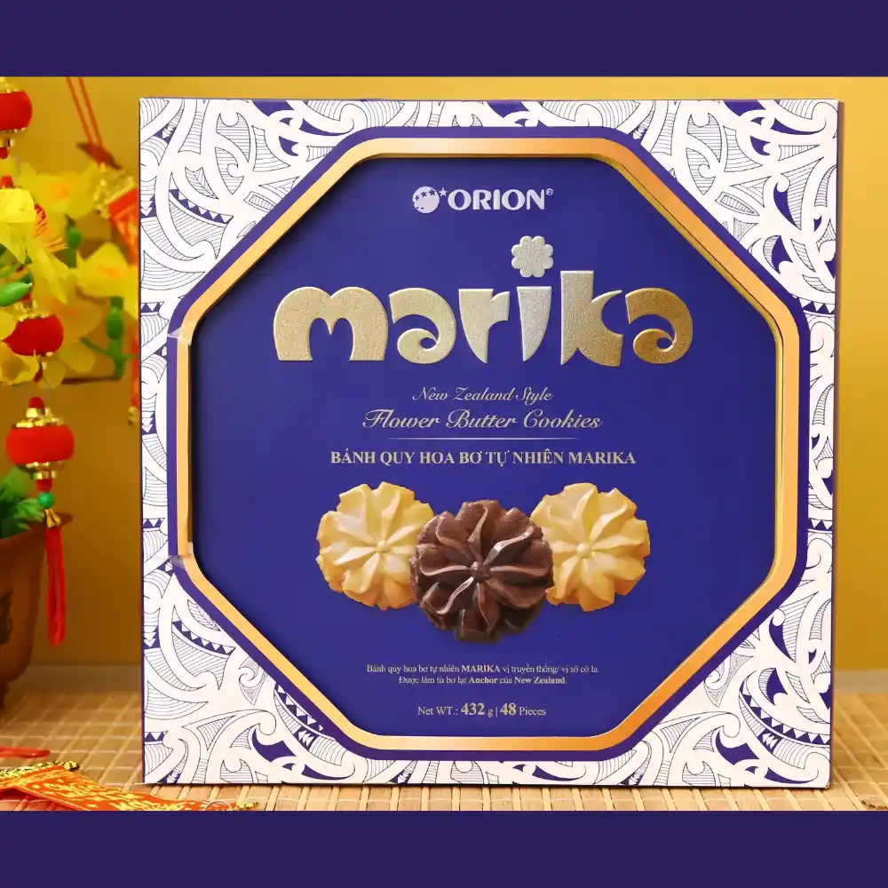 - Bánh Quy Hoa Bơ Tươi Marika với vị bơ truyền thống và chocolate được làm từ những nguyên liệu hảo hạng rồi nướng giòn tan - chắc chắn đem đến cho bạn những trải nghiệm tuyệt vời về vị bơ thơm ngon, dịu nhẹ trong miếng cắn đầu tiên.