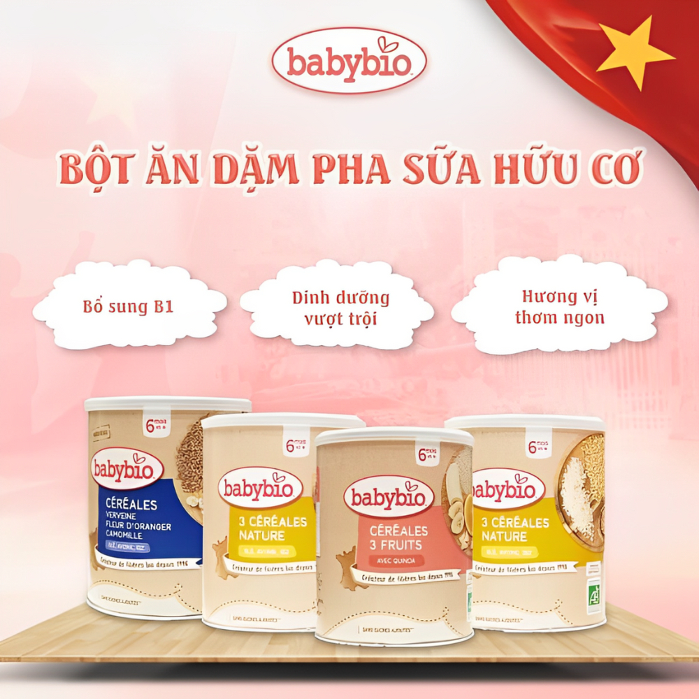 Bột ăn dặm pha sữa hữu cơ nhiều vị bổ sung vitamin B1 Babybio 220g dành cho bé từ 6 tháng tuổi. Bột ăn dặm pha sữa hữu cơ bổ sung vitamin B1 Babybio là thực phẩm dinh dưỡng rất tốt cho sự phát triển của trẻ nhỏ. Sản phẩm được sản xuất trên dây chuyền công nghệ hiện đại, nguyên liệu tự nhiên an toàn cho sức khỏe của bé. Bột ăn dặm hữu cơ Babybio tiện dụng 2 trong 1, vừa có thể pha bột ăn dặm, vừa có thể lắc cùng sữa cho bé ăn mỗi bữa trong ngày. * Thành phần: Bột gạo, bột quinoa, chiết xuất vani Bourbon, vitamin B1,… và các thành phần khác. * Ưu điểm sản phẩm: - Được chứng nhận hữu cơ AB (Pháp) và EU (Châu u). - Không chứa chất phụ gia, không chất làm đặc, không thêm muối, đường, bảo vệ vị giác tinh tế của trẻ. * Đối tượng sử dụng: Sản phẩm dành cho bé từ 6 tháng tuổi trở lên. * Công dụng: - Cung cấp protein, các vitamin và khoáng chất từ gạo và quinoa. - Hỗ trợ tiêu hóa của trẻ. * Hướng dẫn sử dụng: - Pha với sữa cho trẻ sơ sinh theo tỷ lệ: Trong bình sữa: Cho 3 muỗng canh (9g) bột pha sữa vào bình chứa 210ml sữa ấm. Trong bát: Cho 7 thìa (21g) bột pha sữa vào bát chứa 210ml sữa ấm. - Đối với bé đã ăn dặm mặn, có thể xay nhuyễn thịt, cá, trứng, rau, củ, quả… và nấu chín, để hỗn hợp về nhiệt độ ấm, thêm bột ăn dặm Babybio vào và cho bé thưởng thức. * Lưu ý: - Bỏ hết thức ăn thừa còn lại sau khi ăn. - Không sử dụng sản phẩm khi có mùi lạ. - Bảo quản nơi khô ráo, thoáng mát. - Tránh ánh nắng trực tiếp và nơi ẩm ướt. - Để xa tầm tay trẻ em. * Thông tin sản phẩm: - Trọng lượng: 220g. - Thương hiệu: Babybio. - Xuất xứ thương hiệu: Pháp. - Sản xuất tại: Pháp. - Hạn sử dụng: 24 tháng kể từ ngày sản xuất. #botandam #botandamhuuco #botandambabybio #botbabybio #suahuuco #suachobe #suahuucobabybio #bosungdinhduong #botandamcongthuc #bosungdinhduong #botandamoptima #suahuucooptima #bosungloikhuan #suababybiooptima #suaoptimabosungloikhuan #blackpinks #blackpinksvn #blackpinkscom #blackpinkscomvn #blackpink #blackpinkvn #blackpinkcom #blackpinkcomvn #blps #blpsvn #blpscom #blpscomvn #blp #blpvn #blpcom #blpcomvn
