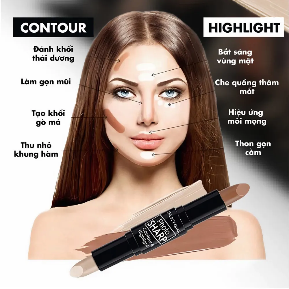 Bút tạo khối 2 đầu SILKYGIRL Photosharp Contour; Highlighter 8g là sản phẩm tạo khối và highlight đến từ thương hiệu mỹ phẩm Silkygirl của Malaysia, với thiết kế 2 đầu tiện dụng gồm 1 đầu giúp tạo khối làm khuôn mặt trở nên thon gọn, thanh thoát hơn, đầu còn lại làm highlight nhằm bắt sáng khuôn mặt trở nên rạng rỡ, tỏa sáng hơn.