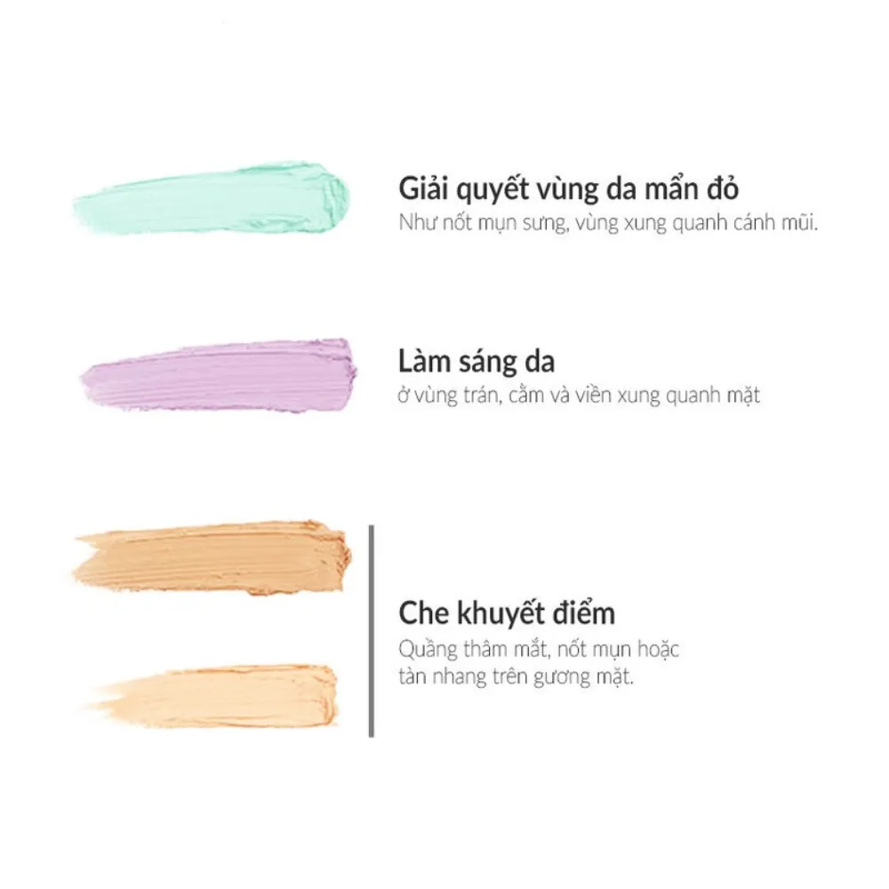- Màu tím trắng: Dùng che quầng thâm mắt hoặc đốm đen, đồi mồi.