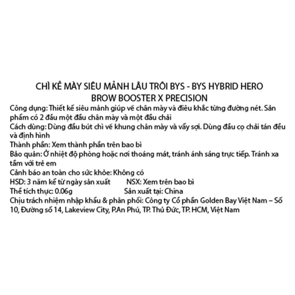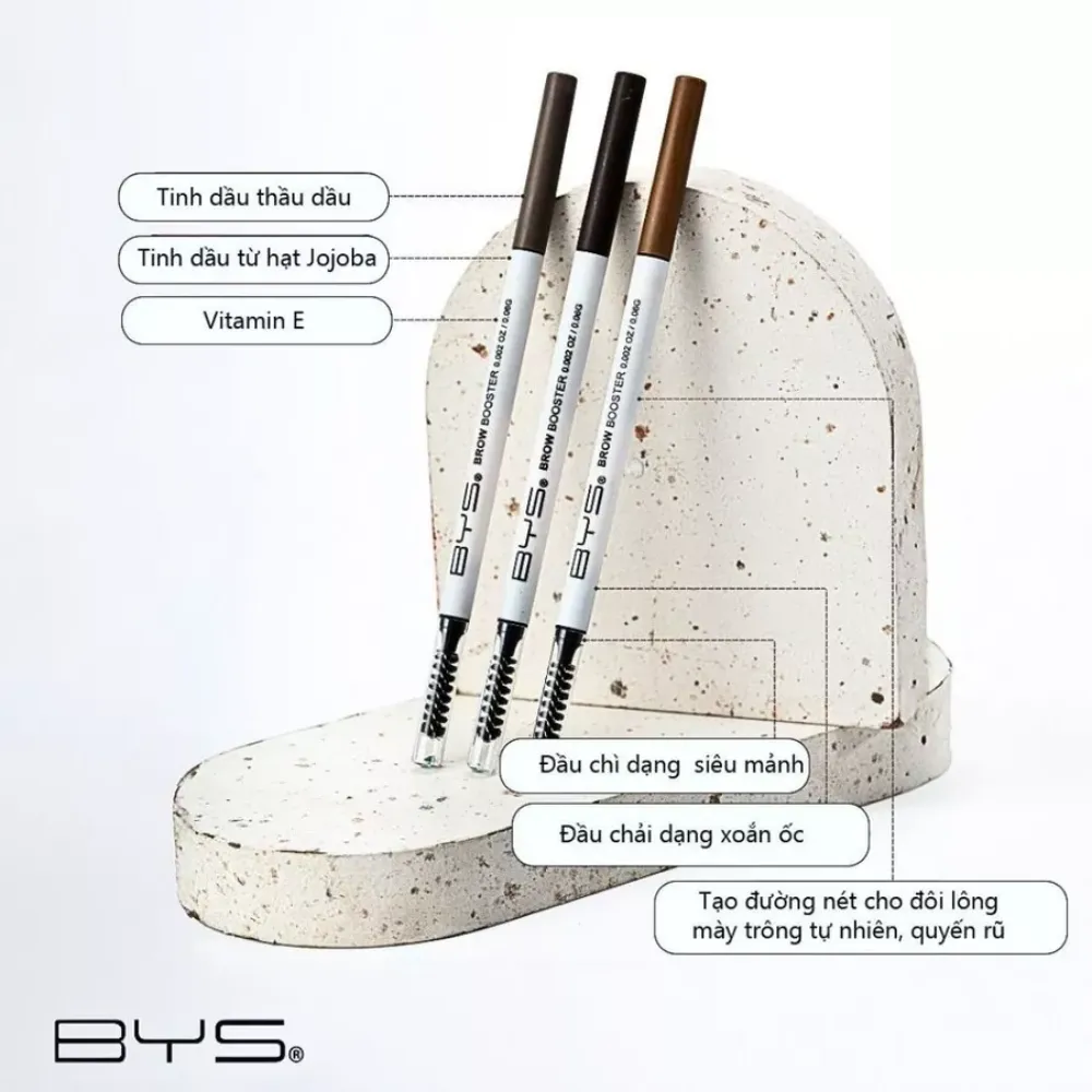 Chì Kẻ Mày BYS Siêu Mảnh Lâu Trôi 0.06g là sản phẩm chì kẻ mày đến từ thương hiệu mỹ phẩm thuần chay BYS của Úc. Sản phẩm có 2 đầu dùng để kẻ chân mày siêu mảnh và tạo dáng chân mày chuẩn nét. Gồm 1 đầu là chì kẻ kích thước 1.5mm, 1 đầu là cọ chải lông mày mang lại đôi chân mày sắc sảo, độ bám màu cao. Bạn có thể vẽ từng sợi lông mày hoặc các góc và đuôi chân mày thật sắc sảo, tự nhiên. Kẻ mày BYS được bổ sung thêm dầu thầu dầu, dầu Jojoba, vitamin E giúp nuôi dưỡng và cho lông mày chắc khỏe.