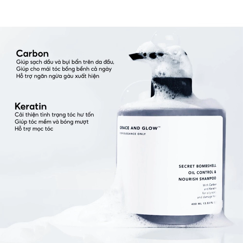 - Carbon: Xử lý sạch dầu và bụi bẩn trên da đầu, giúp ngăn ngừa gàu, giữ cho mái tóc bồng bềnh cả ngày, hấp thụ dầu và bụi bẩn từ da đầu.