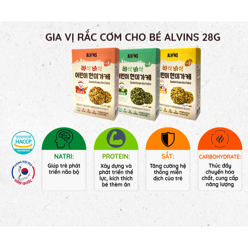 Gia vị rắc cơm cho bé vị gà/vị rau củ/vị tôm Alvins 28g dành cho bé từ 15 tháng tuổi. Gia vị rắc cơm cho bé vị gà/vị rau củ/vị tôm Alvins là sản phẩm đến từ thương hiệu Alvins nổi tiếng. Sản phẩm được các mẹ Hàn Quốc tin dùng - dành cho bé từ 15 tháng trở lên. Gia vị rắc cơm các vị thơm ngon, dễ ăn, giúp các bé ăn ngon miệng hơn. * Thành phần: - Vị tôm: Tôm, cà rốt, khoai lang tím, ớt chuông... và các thành phần khác. - Vị rau củ: Mè, cải bắp, súp lơ xanh, cải bó xôi... và các thành phần khác. - Vị gà: Gà, bí đỏ, trứng gà, phô mai,... và các thành phần khác. * Đặc điểm nổi bật: - Rong được nghiền vụn, nên dễ trộn với cơm/cháo, trẻ dễ nuốt. - Chứa ít muối nên phù hợp cho trẻ nhỏ, vị không mặn. - Cung cấp đầy đủ canxi và dưỡng chất. Vừa ngon, vừa tốt cho sức khỏe. - Mỗi hộp trọng lượng 28g được chia làm 8 gói nhỏ, mỗi gói 3,5g giúp mẹ dễ dàng sử dụng, bảo quản và chia từng bữa ăn cho bé. * Công dụng: - Phát triển não bộ: Rong biển được bổ sung DHA. - Tốt cho hệ xương khớp: Rong biển được bổ sung canxi. * Hướng dẫn sử dụng: - Ăn liền trực tiếp. - Rắc lên cơm/cháo. - Cơm nắm: trộn với cơm rồi viên lại thành cơm nắm. * Lưu ý: - Cần sử dụng ngay sau khi mở túi dù trong thời hạn sử dụng và đóng chặt túi sau khi mở. - Cẩn thận đứt tay do cạnh sắc của bao bì đóng gói. - Sản phẩm này được sản xuất sử dụng cùng dây chuyền sản xuất các sản phẩm trứng, kiều mạch, lạc, đậu nành, lúa mì, cá thu, cua, tôm, thịt lợn, đào, cà chua, quả óc chó, thịt gà, thịt bò, mực, động vật thân nhuyễn (bao gồm hàu, bào ngư, trai), hạt thông. Cần cẩn thận đối với các trường hợp bị dị ứng với một số thành phần được nêu trên. - Không sử dụng gói chống ẩm đóng gói cùng sản phẩm. * Thông tin sản phẩm: - Trọng lượng: 28g. - Thương hiệu: Alvins. - Xuất xứ thương hiệu: Hàn Quốc. - Nhà sản xuất: Kim Nori Co., LTD. - Sản xuất tại: Hàn Quốc. - Hạn sử dụng: 12 tháng kể từ ngày sản xuất. #rongbien #rongbienraccom #giaviraccom #rongbienhuuco #rongbienraccomhuuco #giavihuuco #giaviraccomhuuco #rongbienvihaisan #rongbienraccomvihaisan #rongbienviraucu #rongbienraccomviraucu #giavihaisan #giaviraucu #giaviraccomhaisan #giaviraccomraucu #rongbienchobe #rongbienraccomchobe #giaviraccomchobe #rongbienraccomhanquoc #giaviraccomhanquoc #rongbienalvins #rongbienraccomalvins #giavialvins #giaviraccomalvins #alvins #nhapkhau #alvinshanquoc #alvinsvietnam #blackpinks #blackpinksvn #blackpinkscom #blackpinkscomvn #blackpink #blackpinkvn #blackpinkcom #blackpinkcomvn #blps #blpsvn #blpscom #blpscomvn #blp #blpvn #blpcom #blpcomvn