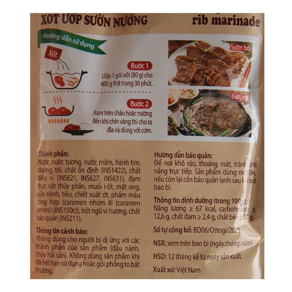 Xốt gia vị của thương hiệu Ottogi là sự lựa chọn hoàn hảo cho những bữa tiệc nướng. Đây là loại gia vị nêm sẵn sở hữu công thức chế biến riêng, mang hương vị vô cùng đậm đà cho món ăn của bạn. Với gói xốt ướp sườn nướng Ottogi 80g cho 400g thịt sườn là bạn sẽ có ngay một món nướng ngon đúng điệu. * Thông tin sản phẩm: - Thương hiệu: Ottogi - Sản xuất: Việt Nam - Hạn sử dụng: 12 tháng * Thông tin nổi bật: Cùng với dây chuyền sản xuất hiện đại, đáp ứng theo hệ thống GMP và HACCP, cùng triết lý kinh doanh đặt chất lượng và dinh dưỡng trong sản phẩm lên hàng đầu, đảm bảo vệ sinh thực phẩm, nên rất an toàn cho sức khỏe của người tiêu dùng. * Thành phần: Nước, nước tương, nước mắm, hành tím, đường, tỏi, chất ổn định, chất điều vị, đạm thực vật thủy phân, muối i-ốt, mật ong, dầu nành, tiêu, chiết xuất ớt, phẩm màu tổng hợp, bột ngũ vị hương, chất bảo quản. * Bảo quản: Bảo quản nơi khô thoáng, tránh ánh nắng trực tiếp. Bảo quản lạnh sau khi mở bao bì. * Hướng dẫn sử dụng: Bước 1, uớp một gói xốt 80g cho 400g thịt trong vòng 30phút. Bước 2, ram trên chảo hoặc nướng đến khi chín vàng là có thể dùng. #xotsuonnuong #xotsuonnuongottogi #xotnuong #xotottogi #xot80g #xotsuon80g #xotsuonnuong80g #xotottogi80g #goixot80g #goixotsuon80g #loc5goixot80g #hop10goixot80g #thung60goixot80g #xotnuongthit #xotuopsuon #xotnuonghanquoc #xotgiadinh #xotchinhhang #xotgiareh #muagoixot #mualoc5goi #muahop10goi #muathung60goi #muathunggiare #giavihanquoc #doanvathanquoc #thucphamhanquoc #nguyenlieunauan #bepgiadinh #xotlammonnuong #xotsuonnuonghangquoc #blackpinks #blackpinksvn #blackpinkscom #blackpinkscomvn #blackpink #blackpinkvn #blackpinkcom #blackpinkcomvn #blps #blpsvn #blpscom #blpscomvn #blp #blpvn #blpcom #blpcomvn #blackpinks.vn_hochiminh #blackpinks.vn_hanoi