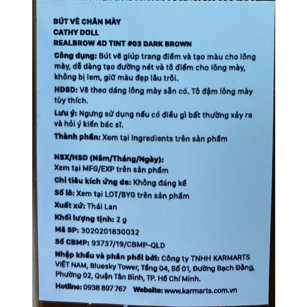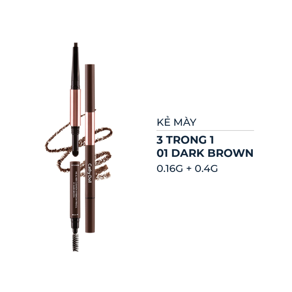 Kẻ mày Cathy Doll 3 trong 1 là sản phẩm chì kẻ mày 3 trong 1 đến từ thương hiệu mỹ phẩm Cathy Doll của Thái Lan, với thiết kế dạng bút 3 đầu với một đầu chì vặn tự động, lên màu đậm chuẩn, chống thấm nước và lâu trôi suốt 6 giờ. Đầu mút cushion ở giữa giúp tán chì đều màu, cùng đầu cọ chải giúp định hình dáng mày mềm mại, vào nếp gọn gàng hơn.