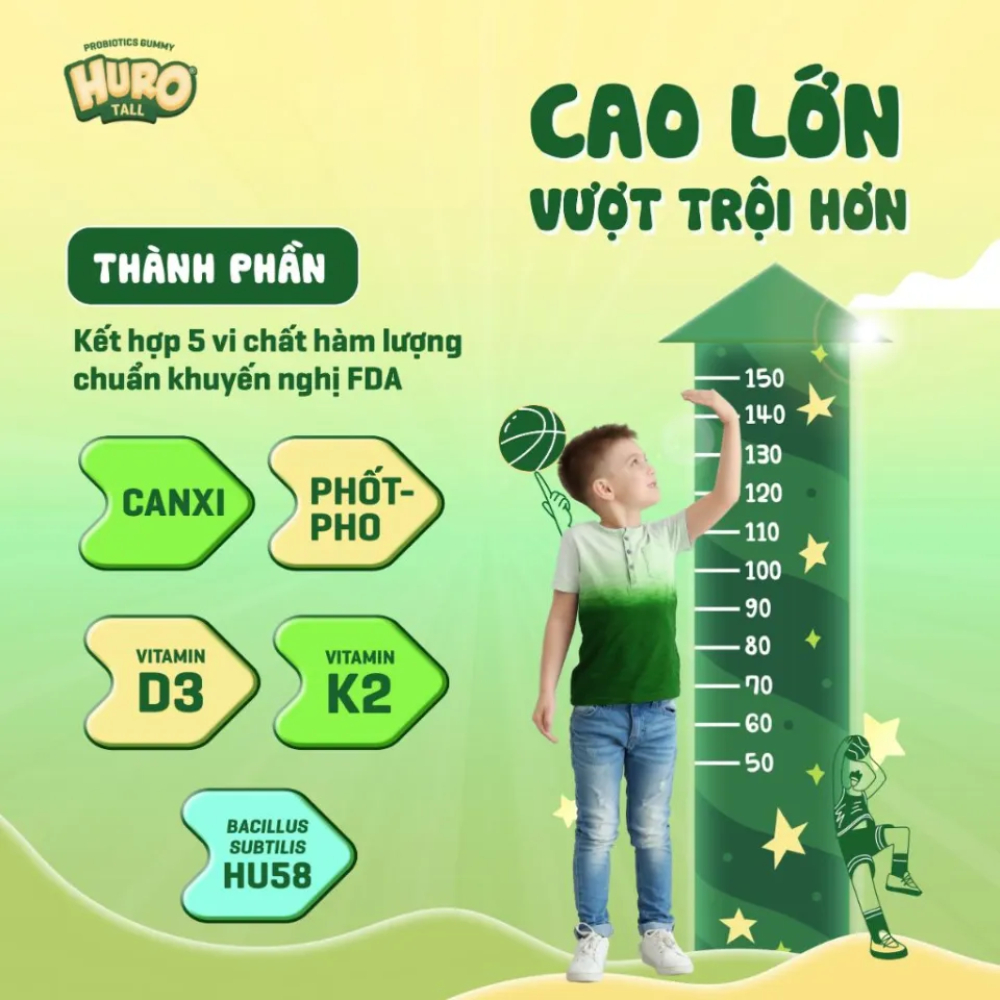 Kẹo dẻo lợi khuẩn Huro tall 168g Thông tin sản phẩm: Kẹo dẻo Huro tall bổ sung lợi khuẩn là sản phẩm kẹo dẻo đầu tiên có mặt tại Việt Nam chứa 1 tỷ lợi khuẩn HU58 - kết quả ra đời từ nghiên cứu của giáo sư Simon Cutting tại một Đại học ở Luân Đôn, Anh Quốc - có tác dụng kích thích hoạt động đường ruột nhờ sản sinh ra một lượng lớn men vi sinh giúp tiêu hóa thức ăn dễ dàng và tối ưu hấp thu dinh dưỡng. Bên cạnh đó, lợi khuẩn còn giúp loại bỏ độc tố ra khỏi cơ thể, làm sạch hệ tiêu hóa để tăng cường miễn dịch đường ruột. Chứa Bacillus subtilis HU58, Canxi, Photpho,... hỗ trợ quá trình phát triển khung xương & chiều cao của trẻ em; hỗ trợ quá trình hấp thu các chất dinh dưỡng & hệ tiêu hoá khoẻ mạnh. Dung tích: 168g Ưu điểm nổi bật: Hỗ trợ quá trình phát triển khung xương & chiều cao của trẻ em. Hỗ trợ quá trình hấp thu các chất dinh dưỡng & hệ tiêu hoá khoẻ mạnh. Dành cho trẻ em từ 2 tuổi trở lên. Hương sữa chua thơm ngon. Đối tượng sử dụng: Trẻ em từ 2 tuổi trở lên và người lớn Công dụng: Phức hợp Canxi, Photpho, Vitamin K2 và Vitamin D3 hỗ trợ quá trình phát triển khung xương và chiều cao ở trẻ em. Lợi khuẩn Bacillus subtilis HU58 hỗ trợ quá trình hấp thu các chất dinh dưỡng & hệ tiêu hóa khỏe mạnh. Thành phần: Bacillus subtilis HU58 2x10⁸ CFU, Ca, P, Vitamin K2, Vitamin D3 và một số thành phần khác. Cách sử dụng: Ăn trực tiếp. 5 viên/lần. Bảo quản: Nơi khô ráo thoáng mát, nhiệt độ dưới 25 độ C. Tránh ánh nắng trực tiếp, nơi có nhiệt độ cao hoặc ẩm ướt. Thông số sản phẩm: Thương hiệu: Huro Xuất xứ thương hiệu: Anh Sản xuất tại: Việt Nam HSD: 2 năm kể từ NSX. #keodeo #keodeoloikhuan #huro #keodeohuro #keodeohurotallbosungloikhuan #keodeobosungloikhuan #blackpinks #blackpinksvn #blackpinkscom #blackpinkscomvn #blackpink #blackpinkvn #blackpinkcom #blackpinkcomvn #blps #blpsvn #blpscom #blpscomvn #blp #blpvn #blpcom #blpcomvn