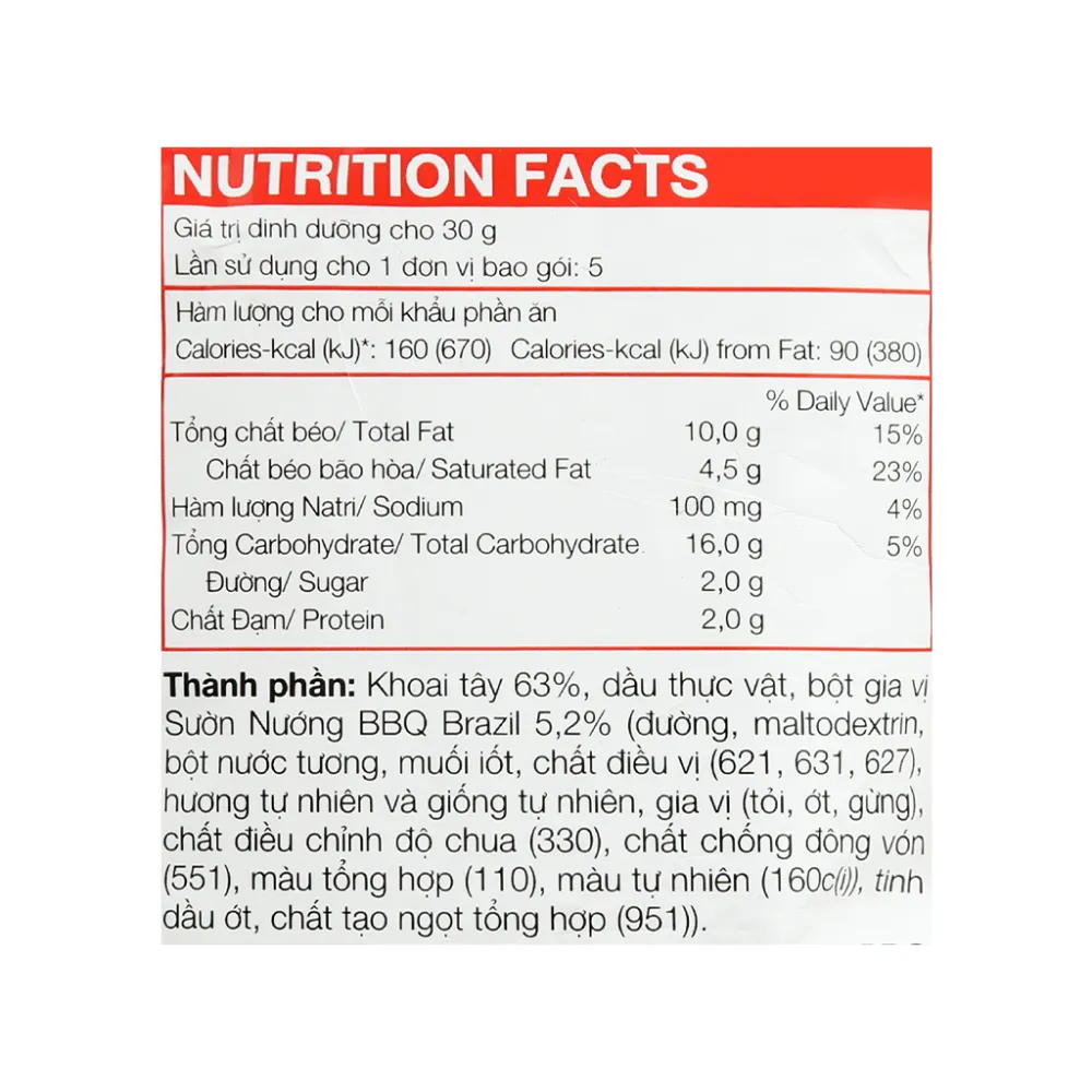 Khoai tây, dầu cọ, bột gia vị sườn nướng BBQ 5.2% (đường, maltodextrin, muối, chất điều vị (E621, E627, E631), chất điều chỉnh độ axit E330, chất chống đông vón (E551, E554), màu tự nhiên E160c, chất tạo ngọt E951, màu tổng hợp E110, hương liệu giống tự nhiên, nước tương)