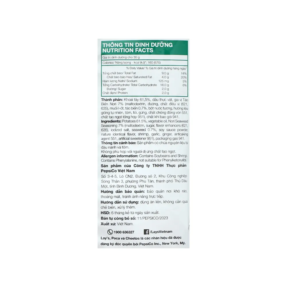 Khoai tây 61.5%, dầu thực vật, bột gia vị tảo biển Nori 7% (maltodextrin, đường, chất điều vị (621, 635), muối i-ốt, bột nước tương, hương liệu giống tự nhiên, tôm, tỏi, gừng, chất chống đông vón, chất tạo ngọt tổng hợp, chất khí đóng gói