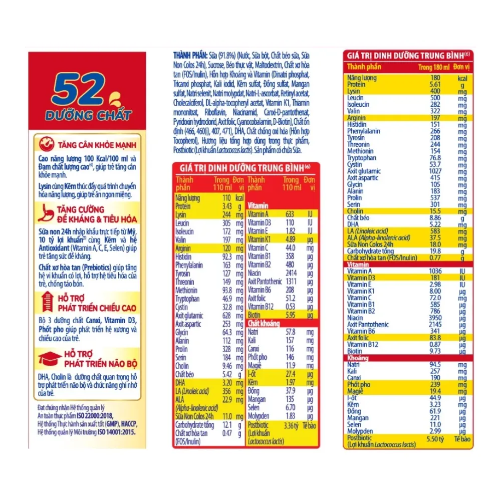 - TĂNG CÂN KHỎE MẠNH: Cao năng lượng 100 Kcal/100 ml và Đạm chất lượng cao cùng 18 axit amin giúp trẻ tăng cân khỏe mạnh. Lysin, Kẽm thúc đẩy quá trình chuyển hóa năng lượng, giúp trẻ ăn ngon miệng.