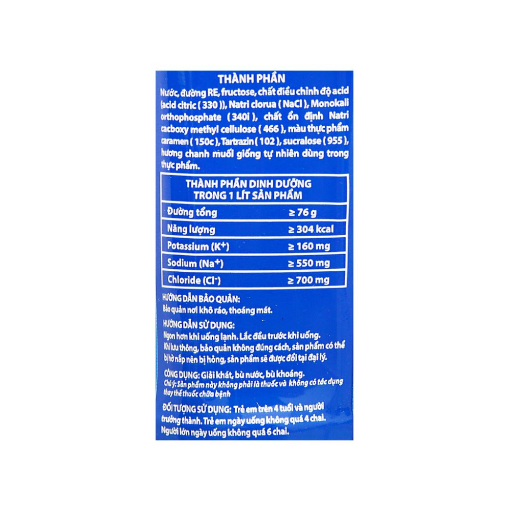 -Nước, đường, muối (natri clorua), chất điều chỉnh độ chua (axit citric), hương chanh muối tổng hợp, vitamin B, chất điện giải (natri, kali, clo).
