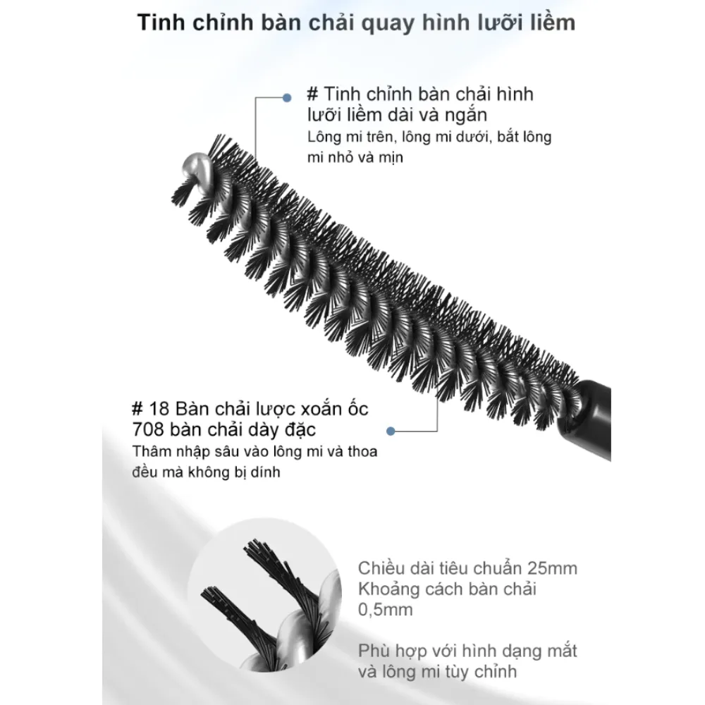 - Thiết kế độc đáo: Lược sợi hiệu ứng kép giúp chải đều mascara từ gốc đến ngọn, không gây vón cục. Đặc biệt phù hợp với những người có lông mi ngắn.
