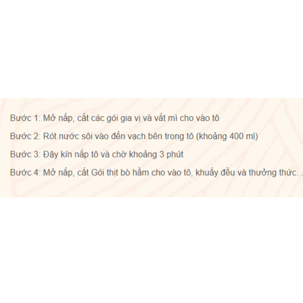 Thông tin sản phẩm: * Thương hiệu: Vifon - Sản xuất tại: Việt nam - Khối lượng: 140g/tô - Hạn sử dụng: 12 tháng kể từ ngày sản xuất * Giới thiệu: - Vifon là thương hiệu đầu tiên tại Việt Nam đặt nền móng cho ngành công nghiệp thực phẩm ăn liền với các sản phẩm sợi ăn liền và gia vị. Từ khi thành lập, Vifon đã luôn nỗ lực để tạo dựng uy tín và thương hiệu với đội ngũ nhân viên giàu kinh nghiệm, nhiệt huyết, trang thiết bị hiện đại để nghiên cứu nhiều sản phẩm đạt chất lượng cao. - Sợi mì dai, trơn, mướt, thấm vị cùng nước soup thơm, ngon bùng vị của bắp bò, vị cay nồng đặc biệt của tỏi, ớt… tạo nên món ăn đặc trưng của ẩm thực Hàn Quốc. * Thành phần: - Sợi mì: Bột mì, tinh bột sắn, dầu cọ, gluten, chất điều chỉnh độ acid, chất làm dày, chất nhũ hóa. - Gói sốt cay: Nước, xốt tương, đường, bột ớt, dầu đậu nành, chiết xuất ớt, bột tỏi, bột hành, gia vị tổng hợp. - Gói rắc (flakes): Mè rang, rong biển khô (có thể có thêm phô mai bột tùy phiên bản). Hướng dẫn sử dụng: Bước 1: Mở nắp, cắt các gói gia vị và vắt mì cho vào tô Bước 2: Rót nước sôi vào đến vạch bên trong tô (khoảng 400 ml) Bước 3: Đậy kín nắp tô và chờ khoảng 3 phút Bước 4: Mở nắp, cắt Gói thịt bò hầm cho vào tô, khuấy đều và thưởng thức. . * Bảo quản: - Bảo quản nơi khô ráo tránh tiếp xúc trực tiếp ánh nắng mặt trời> #vifon #vifonanlien #mivifontoanlien #mibocayhanquocvifonto140g #mibocayhanquocanlienvifon #loc4tomianlienvifon #loc4tomibocayhanquocvifonto140g #loc4tomibocayhanquoc #mihanquoc #thungmibocayhanquocvifonto140g #thungmibocayhanquocanliento140g #thung12tomibocay #thug12tomibocayhanquocto140g #thung12tomianlien #blackpinks #blackpinksvn #blackpinkscom #blackpinkscomvn #blackpink #blackpinkvn #blackpinkcom #blackpinkcomvn #blps #blpsvn #blpscom #blpscomvn #blp #blpvn #blpcom #blpcomvn