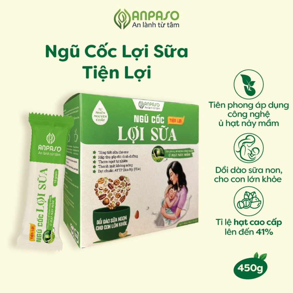 - Ngũ cốc lợi sữa Anpaso là sản phẩm tiên phong áp dụng công nghệ ủ hạt nảy mầm, giúp bổ sung năng lượng và tăng tiết sữa cho mẹ.