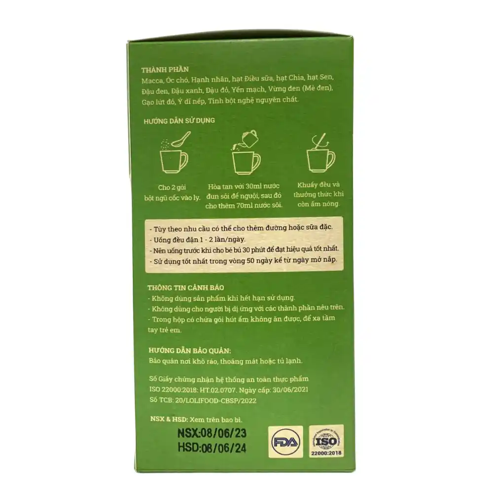 Thành phần : macca, óc chó, hạt điều sữa, hạt sacha inchi, hạnh nhân, hạt chia, hạt sen, đậu đen, đậu xanh, đậu đỏ, yến mạch, gạo lứt đỏ, vừng đen (mè đen)... giúp cung cấp dưỡng chất thiết yếu cho sức khỏe mẹ và bé.