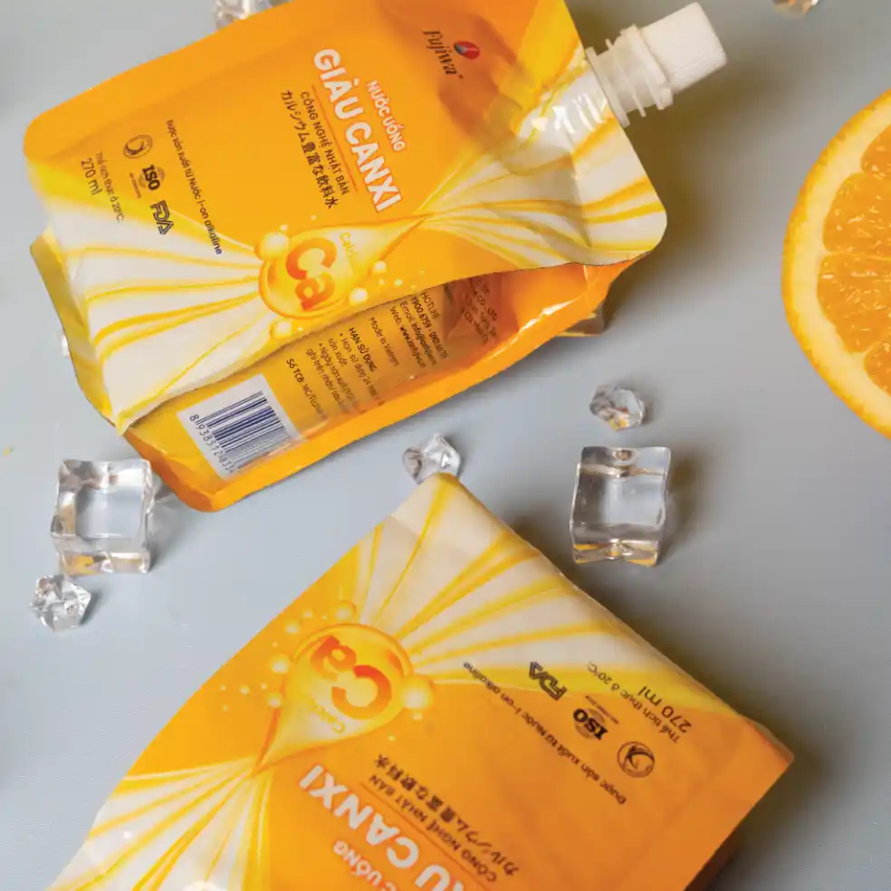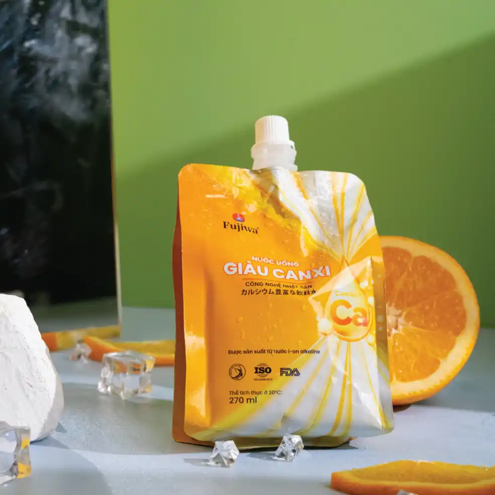 - Tên sản phẩm: Nước uống giàu canxi Fujiwa vị cam túi 270ml