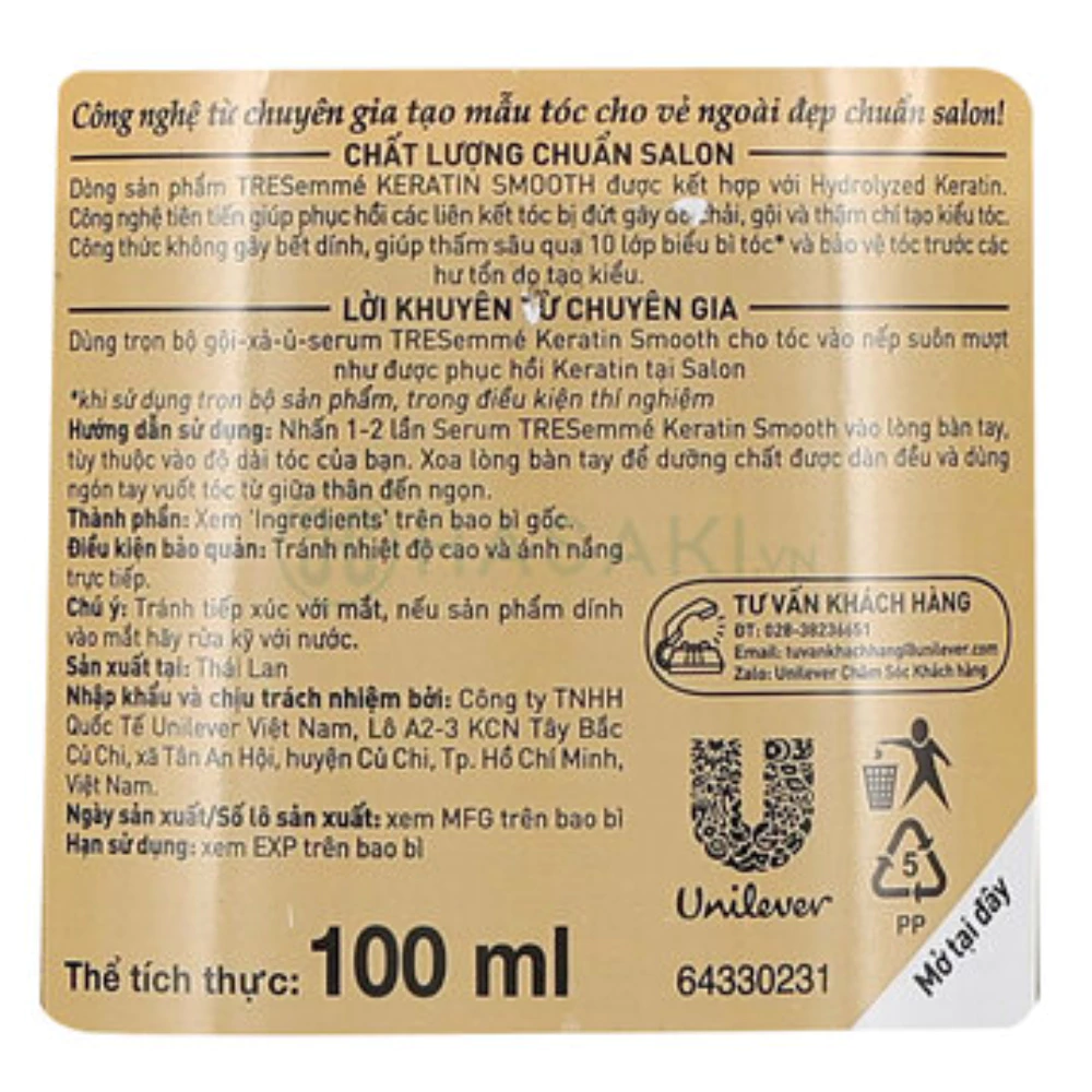Serum dưỡng tóc TRESemmé là sản phẩm serum dưỡng tóc đến từ thương hiệu TRESemmé - Mỹ. Mái tóc là vũ khí bí mật giúp cô gái thêm tự tin, tuy nhiên việc tạo những kiểu tóc thật đẹp và thần thái lại mang đến những hư tổn khiến tóc không còn khoẻ. Từ các tác động lực như buộc tóc cao, buộc tóc lúc còn ướt,…đến các quy trình xử lý nhiệt như uốn, sấy,.. và tác động hoá chất như nhuộm, tẩy,.. và các yếu tố từ môi trường khiến các liên kết tóc bị tổn thương dẫn đến tình trạng rụng tóc, không thể vào nếp và xơ rối.