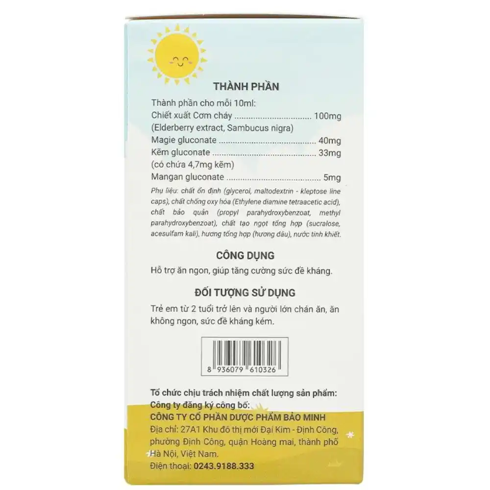 Kẽm gluconate, Chiết xuất cơm cháy, Magie gluconate 40mg, Mangan gluconate 5mg,... và một số thành phần khác.