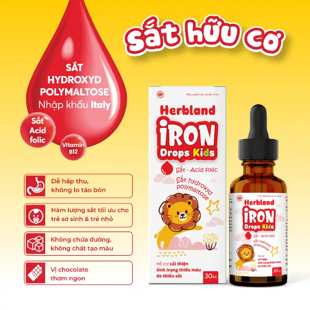 Herbland Iron Drops Kids với công thức thiết kế chuyên biệt cho trẻ sơ sinh và trẻ nhỏ với sự kết hợp Sắt hữu cơ hydroxyd polymaltose, acid folic, vitamin B12 mang lại giải pháp hiệu quả cho trẻ thiếu máu.