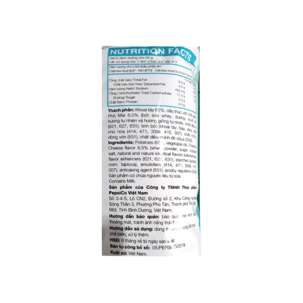 Khoai tây 62%, dầu thực vật, gia vị Phô mai Cheddar 6.5% (bột sữa whey, đường, muối i-ốt, hương liệu (tự nhiên và giống tự nhiên), chất điều vị, tinh bột (khoai tây, bắp, sắn), chất nhũ hóa, chất chống đông vón, chất điều chỉnh độ acid), chất khí đóng gói