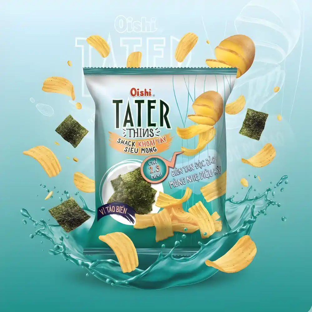 - Loại sản phẩm: Snack khoai tây siêu mỏng vị tảo biển.