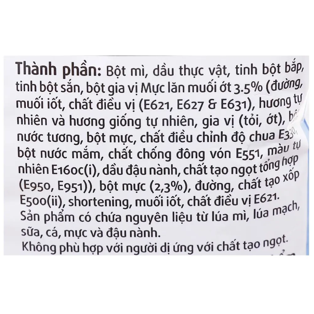 Bột mì, dầu thực vật, tinh bột bắp, tinh bột sắn, bột gia vị Mực lăn muối ớt 3.5% (đường, muối, chất điều vị (E621, E627 & E631), hương mực tự nhiên và giống tự nhiên, gia vị (tỏi, ớt), bột tương đậu nành, bột mực, chất điều chỉnh độ chua E330, chất chống đông vón (E551, E554), bột cá, màu tự nhiên E160c, chất tạo ngọt (E950, E951), oleoresin capsicum), bột mực, đường, chất tạo xốp E500ii, muối, chất điều vị E621, shortening)