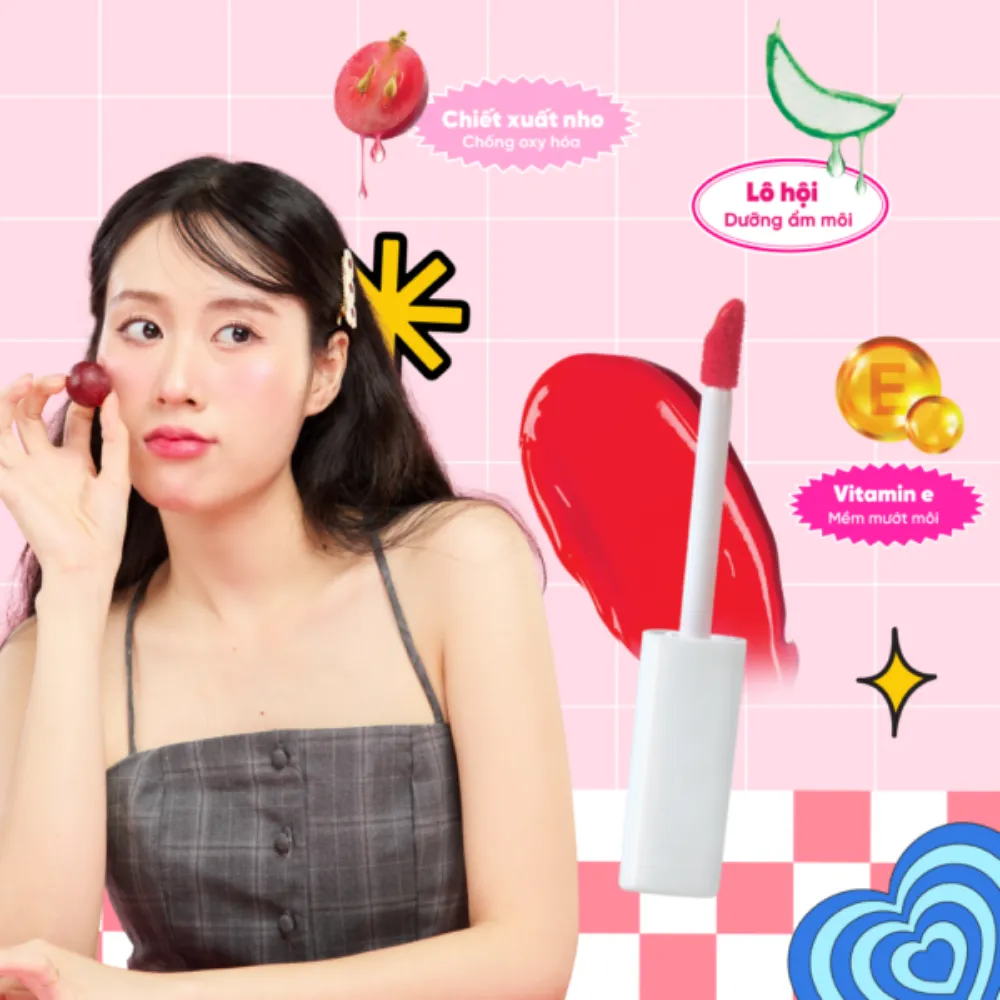 - MLBB Lip Tint không hề làm môi nàng bị khô hay bong tróc khó chịu nhờ vào thành phần chiết xuất từ quả nho giàu chất chống oxy hóa, Vitamin E và tinh chất lô hội, giúp duy trì độ ẩm cho đôi môi luôn mềm mượt trong suốt cả ngày dài.