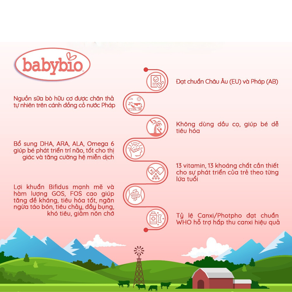 Sữa bò hữu cơ Babybio số 1/số 2/số 3 dòng Optima bổ sung lợi khuẩn 800g dành cho bé từ sơ sinh đến 36 tháng tuổi. Sữa bò hữu cơ Babybio dòng Optima bổ sung lợi khuẩn là dòng sữa dinh dưỡng nội địa của Pháp phù hợp cho các bé trong độ tuổi từ 0 đến 6 tháng tuổi. Babybio số 1 được đánh giá là dòng sữa mang đến cho bé yêu một hệ tiêu hóa khỏe mạnh, hệ dưỡng chất đầy đủ thúc đẩy phát triển cân nặng và chiều cao tối ưu cùng trí não phát triển vượt trội cho con khỏe từ gốc. * Thành phần: Whey khử khoáng, sữa gầy, milk permeate, maltodextrin ngô, dầu thực vật (hướng dương oleic, hạt cải dầu, hướng dương), kem sữa, galacto-oligosaccharides (sữa), khoáng chất,… và các thành phần khác. * Đối tượng sử dụng: - Sữa Babybio số 1: dành cho bé từ sơ sinh đến 6 tháng tuổi. - Sữa Babybio số 2: dành cho bé từ 6 đến 12 tháng tuổi. - Sữa Babybio số 3: dành cho bé từ 10 đến 36 tháng tuổi. * Công dụng: - Tốt cho hệ tiêu hóa. - Tăng cường hỗ trợ phát triển cân nặng. - Phát triển toàn diện cả về chiều cao và trí não. * Hướng dẫn sử dụng: - Làm sạch và tiệt trùng cẩn thận bình sữa, núm vú. - Thêm lượng nước cần thiết với nhiệt độ tối đa 40 độ C vào bình. - Thêm số lượng sữa cần thiết vào bình (1 muỗng cho 30ml nước). - Đậy và lắc mạnh bình. Kiểm tra nhiệt độ bên trong bằng cổ tay của bạn. * Lưu ý: - Rửa tay trước mỗi lần chuẩn bị. - Bình sữa nên được chuẩn bị ngay trước bữa ăn. - Chỉ sử dụng muỗng đo lường có trong hộp này. - Sau bữa ăn, làm sạch bình sữa và tất cả các dụng cụ kỹ lưỡng. - Không sử dụng sản phẩm khi có mùi lạ. - Bảo quản nơi khô ráo, thoáng mát. - Tránh ánh nắng trực tiếp và nơi ẩm ướt. - Để xa tầm tay trẻ em. * Thông tin sản phẩm: - Trọng lượng: 800g. - Thương hiệu: Babybio. - Xuất xứ thương hiệu: Pháp. - Sản xuất tại: Pháp. - Hạn sử dụng: 24 tháng kể từ ngày sản xuất. #suabo #suabohuuco #suabobabybio #suababybio #suahuuco #suachobe #suahuucobabybio #suaso1 #suaso2 #suaso3 #suabooptima #suahuucooptima #bosungloikhuan #suababybiooptima #suaoptimabosungloikhuan #blackpinks #blackpinksvn #blackpinkscom #blackpinkscomvn #blackpink #blackpinkvn #blackpinkcom #blackpinkcomvn #blps #blpsvn #blpscom #blpscomvn #blp #blpvn #blpcom #blpcomvn