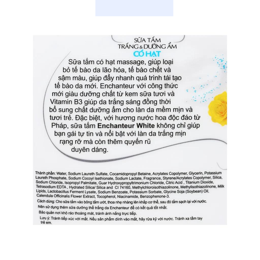 Sữa tắm trắng và dưỡng ẩm có hạt Enchanteur Charming 180g. Sữa tắm trắng và dưỡng ẩm có hạt Enchanteur Charming giúp nhẹ nhàng tẩy sạch tế bào chết, cho da mịn màng và trắng sáng hơn. Hương nước hoa Pháp cao cấp, nồng nàn khó phai đem lại sự lôi cuốn diệu kỳ cho phụ nữ. * Thành phần: Dưỡng chất từ kem sữa tươi, Vitamin B3,... và các thành phần khác. * Ưu điểm sản phẩm: - Là sản phẩm có chứa dưỡng chất từ kem sữa tươi và vitamin B3, sữa tắm có hạt Enchanteur White Charming 450g giúp da trắng sáng, mềm mại hơn. - Sản phẩm có hạt massage, loại bỏ tế bào chết, tế bào lão hóa, làm sạch sâu cho da, giúp đẩy mạnh quá trình tái tạo da, mang đến cảm giác thông thoáng mịn màng. - Hương nước hoa độc đáo từ Pháp, mang đến sự quyến rũ, nhẹ nhàng đầy tinh tế cho những cô gái. * Đối tượng sử dụng: Sữa tắm dùng được cho mọi loại da, các bạn nữ có thể yên tâm có thể chọn dùng. * Công dụng: - Giúp nhẹ nhàng tẩy sạch tế bào chết, cho da mịn màng và trắng sáng hơn. - Giúp duy trì sức sống tươi trẻ cho làn da. * Hướng dẫn sử dụng: - Tắm sơ qua với nước. - Cho một lượng sữa tắm vào lòng bàn tay tạo bọt và tiến hành massage nhẹ nhàng. - Sau đó tắm lại với nước và lau khô. * Lưu ý: - Bảo quản nơi khô ráo, thoáng mát, tránh ánh nắng trực tiếp. - Không để sản phẩm tiếp xúc với mắt, nếu có thì rửa kĩ với nước. - Để xa tầm tay trẻ em. * Thông tin sản phẩm: - Trọng lượng: 180g. - Thương hiệu: Enchanteur. - Xuất xứ thương hiệu: Việt Nam. - Nhà sản xuất: Công ty TNHH Wipro Unza Việt Nam. - Sản xuất tại: Việt Nam. - Hạn sử dụng: 3 năm kể từ ngày sản xuất. #suatam #suatamenchanteur #suatamthiennhien #suatamcharming #suatamcohat #suatamenchanteurthiennhien #suatamthiennhiencharming #suatamthiennhiensensation #suatamthiennhienenchanteur #duongda #suatamduongda #enchanteur #enchanteurvietnam #blackpinks #blackpinksvn #blackpinkscom #blackpinkscomvn #blackpink #blackpinkvn #blackpinkcom #blackpinkcomvn #blps #blpsvn #blpscom #blpscomvn #blp #blpvn #blpcom #blpcomvn