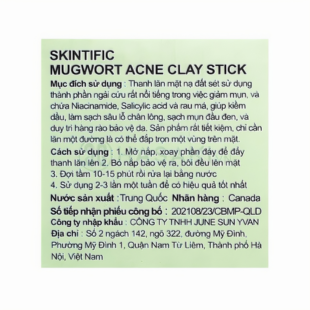 Thanh lăn mặt nạ đất sét Skintific Acne Clay Stick Ngải Cứu giảm mụn 40g là sản phẩm mặt nạ rửa đến từ thương hiệu Skintific - Canada. Bên cạnh thành phần chính là ngải cứu, sản phẩm còn chứa Niacinamide, Salicylic acid và rau má giúp kiềm dầu, làm sạch sâu lỗ chân lông, sạch mụn đầu đen, làm dịu da. Thanh lăn này còn có tác dụng làm dịu mụn, thu nhỏ lỗ chân lông, làm sáng và đều màu da hơn.