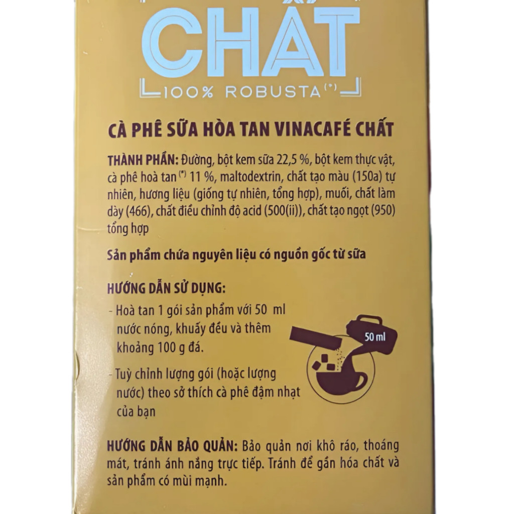 Với công thức đặc biệt giữ trọn 100% hương vị của nước cốt đầu, cho ra ly cà phê sữa đá đậm đà hài hòa giữa vị cà phê đắng và vị sữa ngọt ngào thơm béo đúng chất cà phê sữa đá Sài Gòn. Sản phẩm dạng cà phê hòa tan tiện lợi có ngay chỉ sau 2 phút cho ngày mới tràn hứng khởi. * Đặc điểm công dụng: - Cà Phê Sữa Đá Vinacafe Chất được làm từ 100% nước cốt đầu cà phê rang xay nguyên chất, sản phẩm tái hiện trọn vẹn hương vị cà phê nồng nàn, hậu ngọt sâu lắng và vị đắng đặc trưng, giúp bạn cảm nhận trọn vẹn hương vị cà phê Việt mỗi ngày. - Sự kết hợp hoàn hảo giữa cà phê và sữa trong Vinacafé Chất 3in1 mang đến một ly cà phê sữa đá đậm đà, dễ dàng thưởng thức mà không cần phải pha chế phức tạp. Với thiết kế gói tiện lợi, bạn có thể dễ dàng mang theo và thưởng thức ly cà phê sữa đá thơm ngon ở bất cứ đâu, từ công sở cho đến những chuyến đi xa. - Sản phẩm không chỉ tiết kiệm thời gian mà còn giúp bạn tận hưởng hương vị cà phê đậm đà, thơm ngon, mang đậm "Chất" cà phê Việt ngay trong từng ngụm. * Thành phần: - Đường, bột kem (33%)(dầu thực vật, đường, chất khô từ sữa, glucose syrup, chất ổn định (340ii, 452i), chất điều chỉnh độ axit (331iii), chất nhũ hóa (471, 472e), chất chống đông vón (551), tinh bột biến tính (1450)), bột cà phê nguyên chất từ nước cốt đầu tiên (9,3%), maltodextrin, màu thực phẩm (150a), hương cà phê giống tự nhiên và hương tổng hợp (hương vanilla, hương sữa đặc), muối I-ốt, chất làm dầy (466), chất tạo ngọt tổng hợp (950). Sản phẩm chứa nguyên liệu có nguồn gốc từ sữa. * Hướng dẫn sử dụng: - Uống lạnh: hòa tan 2 gói sản phẩm với 50ml nước nóng, khuấy đều và thêm đá tùy sở thích - Uống nóng: hòa tan mỗi gói sản phẩm với 50ml nước nóng và khuấy đều. Tùy chỉnh lượng gói (hoặc nước nóng) theo sở thích cà phê đậm nhạt của bạn * Bảo quản: - Bảo quản nơi khô ráo thoáng mát - Tránh nơi có ánh nắng trực tiếp - Không dùng sản phẩm hết hạn, có màu mùi lạ * Thông tin sản phẩm: - Xuất xứ thương hiệu: Việt Nam. - Nơi sản xuất: Việt Nam. - Hạn sử dụng: 18 tháng kể từ ngày sản xuất #caphe #caphehoatan #caphegoi #capheuonglien #caphesua #caphehop #dochebiensan #caphephaphin #caphephin #caphenguyenchat #caphechat #vinacafe #vinacafechat #caphesuahoatan #caphesuachat #caphesuavinacafe #cafe #douong #masan #caphemasan #caphechat240g #caphevinacafe240g #caphesuachat240g #chinhhang #vietnam #thungcaphechat #thungcaphesuachat #thungvinacafe #thung24hopcaphechat #blackpinks #blackpinksvn #blackpinkscom #blackpinkscomvn #blackpink #blackpinkvn #blackpinkcom #blackpinkcomvn #blps #blpsvn #blpscom #blpscomvn #blp #blpvn #blpcom #blpcomvn