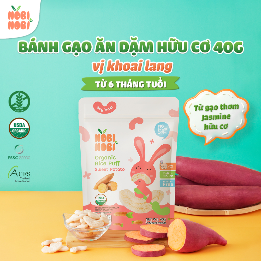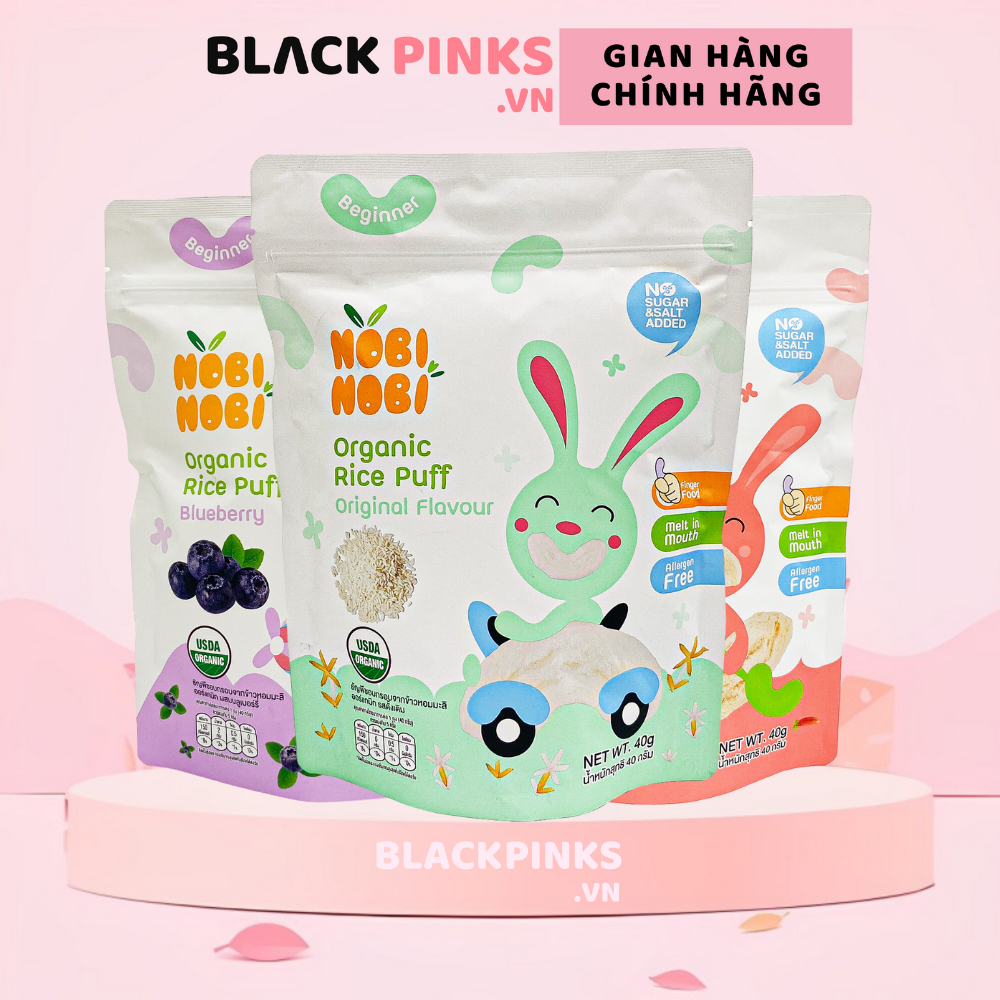 Thực phẩm bổ sung bánh gạo ăn dặm hữu cơ cho bé Nobi Nobi các vị 40g dành cho bé từ 6 tháng tuổi trở lên. Thực phẩm bổ sung bánh gạo ăn dặm hữu cơ cho bé Nobi Nobi là sản phẩm đến từ thương hiệu Nobi Nobi có xuất xứ từ Thái Lan. Với các thành phần hữu cơ, bánh gạo ăn dặm Nobi Nobi có hương vị thơm ngon, dễ ăn và giúp bé bổ sung canxi và vitamin E. * Thành phần: Gạo Jasmine hữu cơ, bột việt quất hữu cơ, bột khoai lang hữu cơ, đường mía hữu cơ, tinh bột sắn hữu cơ, dầu hướng dương hữu cơ, Calci carbonat (INS 170(i)), vitamin E tự nhiên (INS 307(b)), hương việt quất tự nhiên, hương vị khoai lang tự nhiên,… và các thành phần khác. * Ưu điểm sản phẩm: - Làm từ gạo thơm Jasmine hữu cơ - giống gạo nổi tiếng thơm ngon tại Thái Lan. - Thành phần từ gạo nên bánh cực dễ tan, hạn chế tình trạng hóc nghẹn. - Sản phẩm có kết cấu khoa học giúp bé dễ cầm nắm, bốc nhón. - Sử dụng công nghệ nướng chín, không chiên qua dầu, an toàn cho bé. - Hương vị thanh thuần, thơm ngon, dễ ăn, vừa tay. - Thiết kế bao bì với màu sắc bắt mắt, thu hút trẻ và kích thích trí não trẻ phát triển. - Dạng túi zip thuận tiện cho sử dụng và bảo quản. - Đặc biệt bánh hoàn toàn không chứa chất tạo màu, không chất bảo quản, không hương liệu tổng hợp. - Không thêm muối và đường - không gluten - không 8 chất gây dị ứng. - Đạt chuẩn hữu cơ USDA đảm bảo an toàn, lành tính. * Đối tượng sử dụng: Sản phẩm dành cho bé từ 6 tháng tuổi. * Công dụng: - Bổ sung canxi và vitamin E. * Hướng dẫn sử dụng: - Sử dụng ngay sau khi mở gói. * Lưu ý: - Bảo quản nơi khô ráo, thoáng mát. - Tránh ánh nắng trực tiếp và nơi ẩm ướt. * Thông tin sản phẩm: - Trọng lượng: 40g. - Thương hiệu: Nobi Nobi. - Xuất xứ thương hiệu: Thái Lan. - Sản xuất tại: Thái Lan. - Hạn sử dụng: 12 tháng kể từ ngày sản xuất. #banhgao #banhgaohuuco #banhgaonobinobi #botnobinobi #banhgaohuuco #suachobe #banhgaohuuconobinobi #bosungdinhduong #banhgaocongthuc #bosungdinhduong #banhgaooptima #banhgaohuucoandam #bosungloikhuan #banhgaonobinobioptima #suaoptimabosungloikhuan #nobinobi #nobinobithailan #nobinobivietnam #banhgaothailan #blackpinks #blackpinksvn #blackpinkscom #blackpinkscomvn #blackpink #blackpinkvn #blackpinkcom #blackpinkcomvn #blps #blpsvn #blpscom #blpscomvn #blp #blpvn #blpcom #blpcomvn