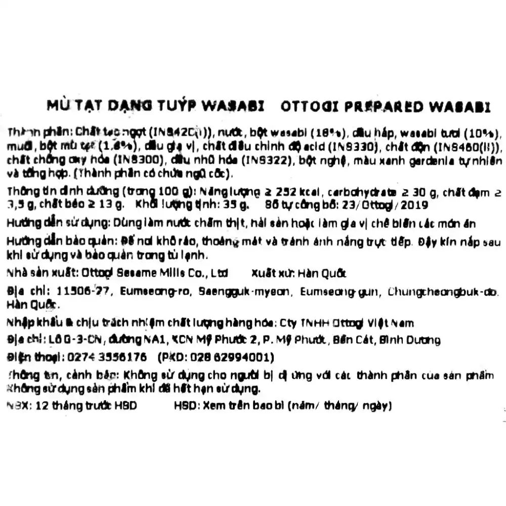 Mù tạt Ottogi có xuất xứ từ Hàn Quốc, mù tạt còn cung cấp nhiều khoáng chất, vitamin giúp làm chậm quá trình lão hóa, điều hòa lưu thông máu,... Mù tạt wasabi Ottogi tuýp 35g dùng làm nước chấm với các loại hải sản, hạn chế các mùi tanh và mang đến vị ngon, hấp dẫn cho món ăn.