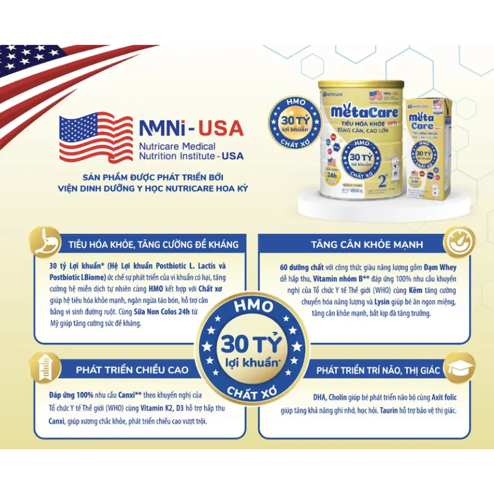 Sữa dinh dưỡng pha sẵn Metacare Opti là sản phẩm dinh dưỡng chất lượng cao, được nhiều ba mẹ tin dùng cho con. Với công thức Opti+ độc quyền và nhiều dưỡng chất thiết yếu, sữa sẽ giúp bé phát triển toàn diện cả về thể chất và trí tuệ.