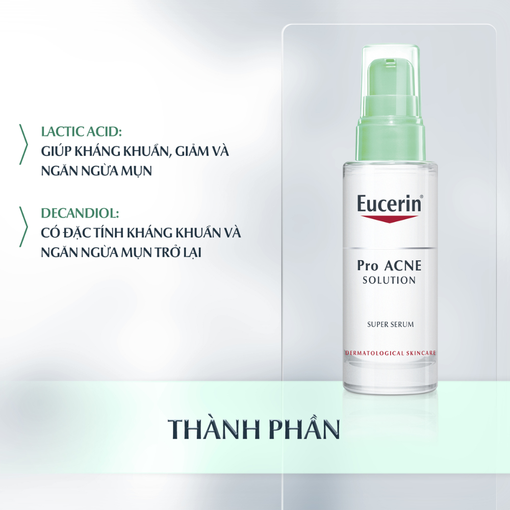 Eucerin ProAcne Super Serum được sử dụng như một bước trong tiến trình làm sạch và chăm sóc da với nhiệm vụ giải quyết những nguyên nhân chính làm cho da sinh ra nhờn và mụn. Sản phẩm với Lactic Acid giúp làm giảm mụn trứng cá, cải thiện màu da và thu nhỏ lỗ chân lông, kết hợp với Decandiol là chất có tác dụng diệt khuẩn và giúp ngăn ngừa da bị mụn trở lại sẽ giúp chăm sóc da một cách nhẹ nhàng và tác động lên da giúp da hấp thu nhanh các hoạt chất cần thiết. Khi sử dụng thường xuyên, ProAcne Super Serum sẽ giúp cải thiện làn da rõ rệt và mang lại cho bạn một làn da khỏe khoắn, mịn màng và tươi sáng hơn.