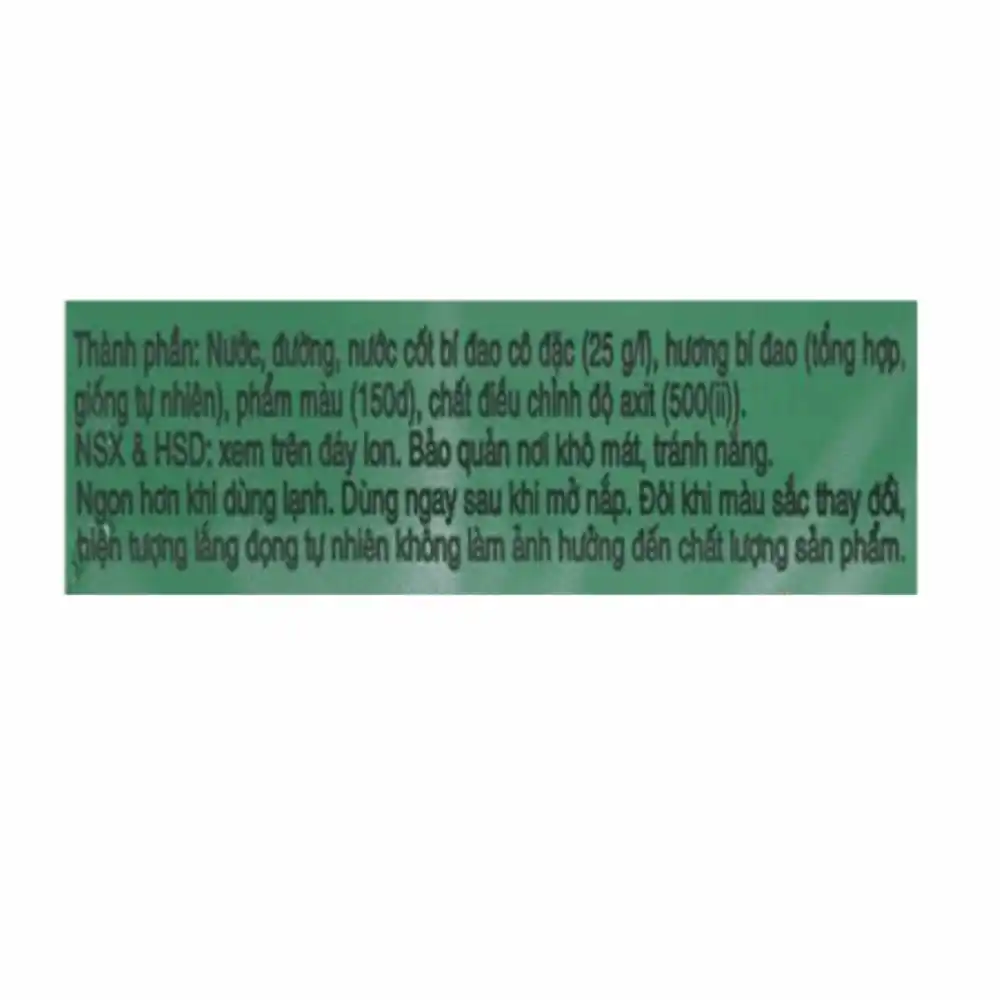 * Thành phần: Nước, đường, nước cốt bí đao cô đặc (25 g/l), hương bí đao (tổng hợp, giống tự nhiên), màu tổng hợp (caramen nhóm IV (150d)), chất điều chỉnh độ axit (500(ii)).