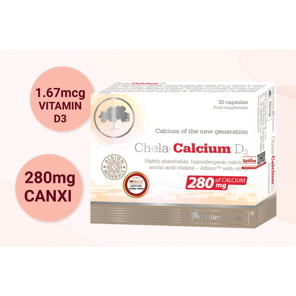 Viên canxi Chela-Calcium D3 là sản phẩm canxi hữu cơ cho mẹ bầu, mẹ sau sinh, trẻ em từ 6 tuổi, thanh thiếu niên, người lớn, người già cần bổ sung canxi … với thành phần 280mg canxi Albion dễ hấp thu kết hợp 1.67mcg Vitamin D3 - hỗ trợ giúp xương chắc khỏe