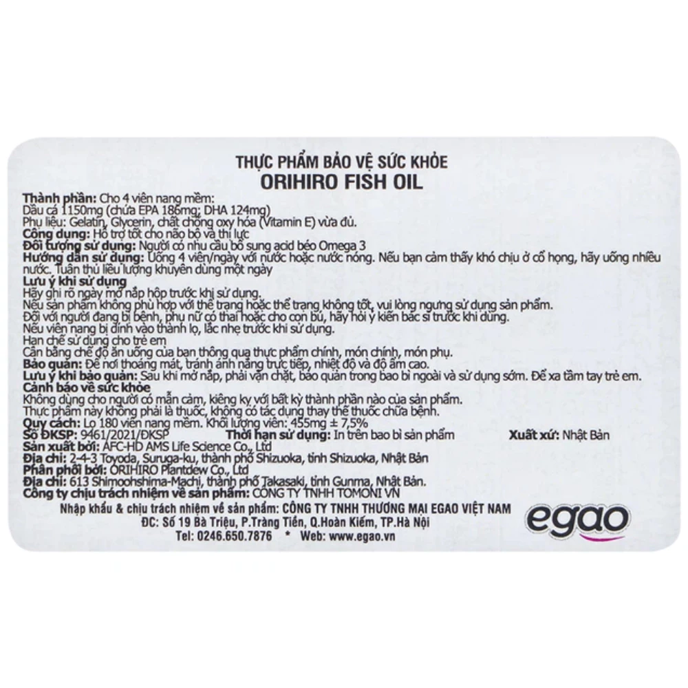 EPA, DHA, lượng Calo, Protein, Lipid, Carbohydrate, muối tương đương,...