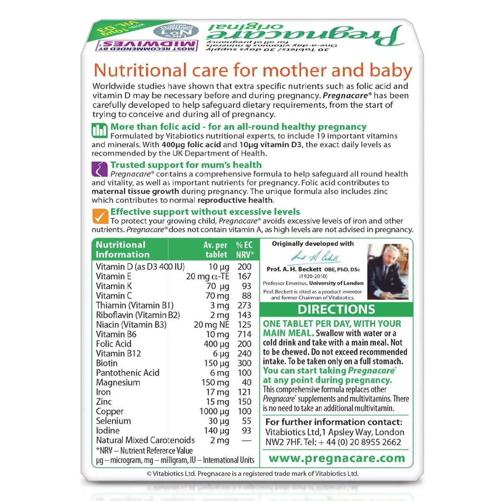 Một thai kỳ khỏe mạnh là mong muốn của hầu hết mẹ bầu. Việc duy trì một chế độ dinh dưỡng đầy đủ và cân đối không chỉ là tiền đề cho sự phát triển toàn diện của trẻ sau này mà còn giúp mẹ bầu chống lại các tác nhân gây bệnh từ môi trường. Thế nhưng, ở những giai đoạn đầu của thai kỳ, tình trạng ốm nghén liên tục có thể khiến chị em phụ nữ trở nên kén ăn. Điều này có thể gây ảnh hưởng đến quá trình tăng trưởng của trẻ nhỏ bởi giai đoạn này, con cần nhiều dưỡng chất thiết yếu để hình thành hàng rào miễn dịch. Chính vì thế, sản phẩm Vitabiotics Pregnacare Original là lựa chọn hoàn hảo để mẹ có thể đảm bảo đáp ứng được các nhu cầu dinh dưỡng của con.